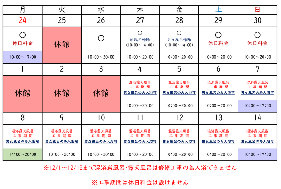 2025年11月・12月 日帰り入浴 受け入れカレンダー