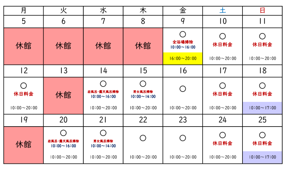 ※ご宿泊の受入人数によって、日帰り入浴をお断りする場合がございます。恐れ入りますが、事前にお問い合わせ頂くか下記のカレンダーを参照ください。